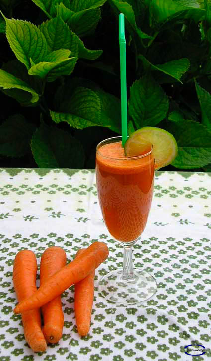 Lave las zanahorias con un cepillo, y páselas por el extractor, en un vaso de vidrio agregue las gotas de aceite de oliva y deje que caiga el jugo extraído de la máquina. Opción, estos jugos se pueden alternar con manzana, apio, remolacha, rábano blanco, raíz de perejil, etc.